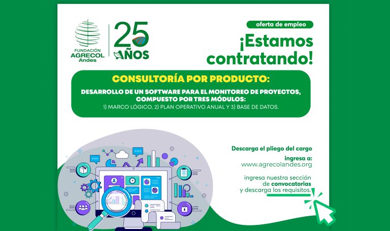 La FUNDACIÓN AGRECOL Andes, requiere Consultoría por producto: DESARROLLO DE UN SOFTWARE PARA EL MONITOREO DE PROYECTOS, COMPUESTO POR TRES MÓDULOS:1) MARCO LÓGICO, 2) PLAN OPERATIVO ANUAL Y 3) BASE DE DATOS. Las personas interesadas que cumplan con..