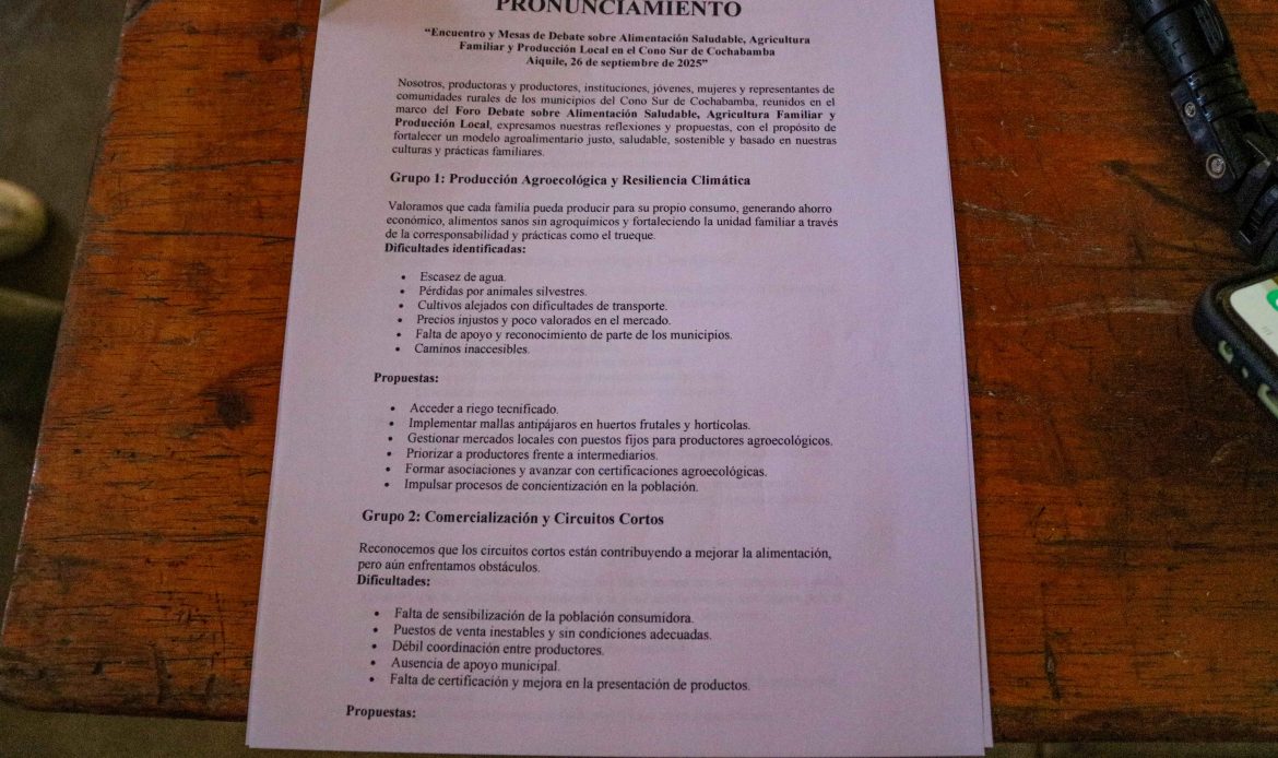 Entre los acuerdos y conclusiones más importantes del evento, los asistentes reafirmaron su compromiso con la agroecología, la producción local y la alimentación saludable, como pilares esenciales para el bienestar de las familias y la sostenibilidad de la Casa Común. Al mismo tiempo, exigen a los gobiernos municipales, aplicar de manera más efectiva y decidida las leyes y normativas en favor de la producción agroecológica, asignando los recursos económicos suficientes para su implementación. De la misma forma, se invitó a toda la sociedad civil no solo aiquileña, sino también de todo el departamento y el país, especialmente consumidores, a sumarse en la construcción sistemas alimentarios justos, inclusivos y sostenibles, que se valore el trabajo campesino familiar ecológico y que, garantice salud y vida digna para las presentes y futuras generaciones.
