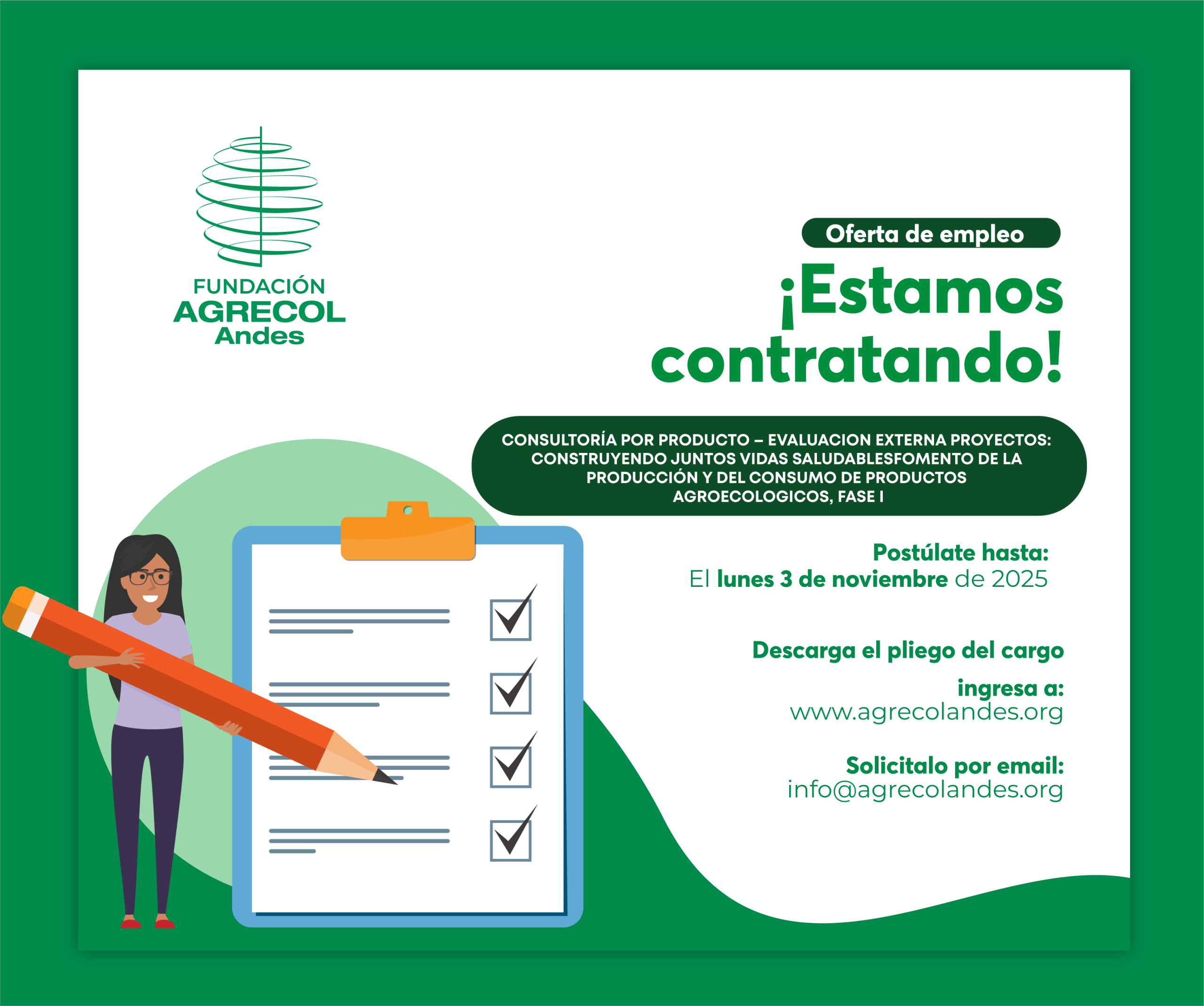 La FUNDACIÓN AGRECOL Andes, requiere Consultoría por producto en: EVALUACIÓN EXTERNA PROYECTOS: CONSTRUYENDO JUNTOS VIDAS …